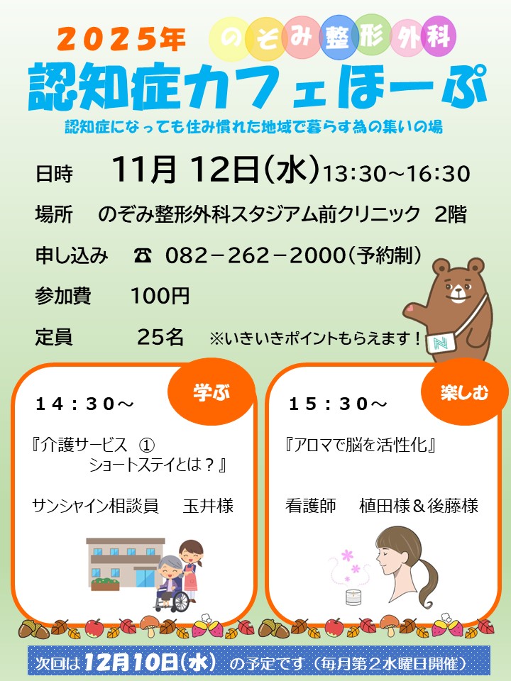 11月12日(水)認知症カフェほーぷ開催のお知らせ-のぞみ整形外科スタジアム前クリニック-