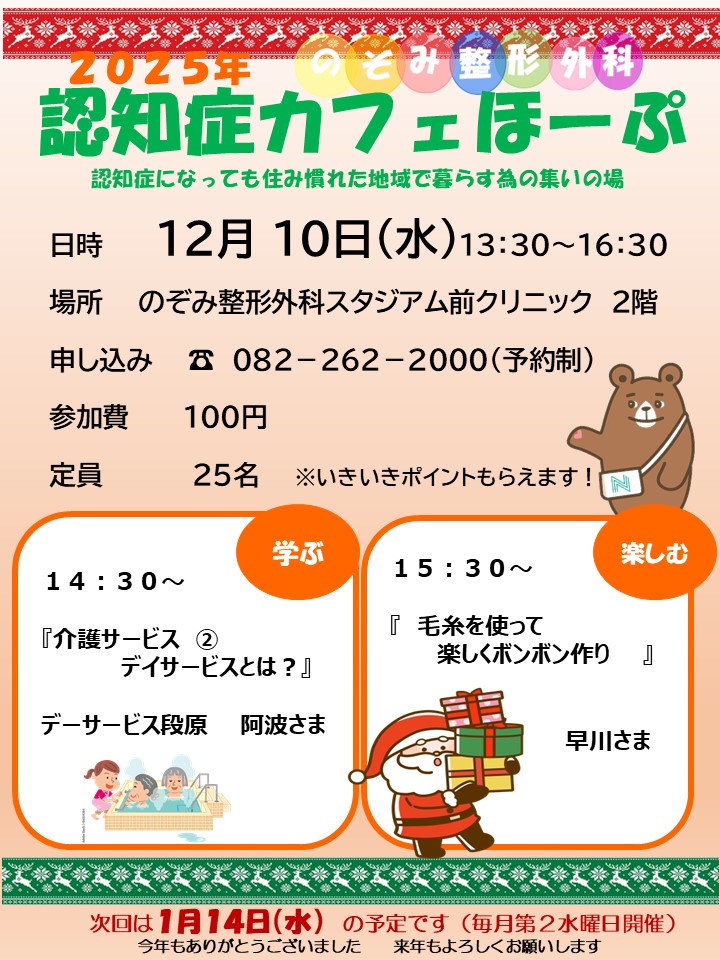12月10日(水)認知症カフェほーぷ開催のお知らせ-のぞみ整形外科スタジアム前クリニック-