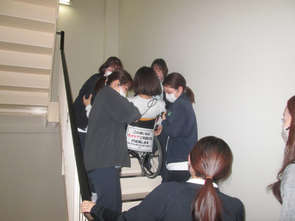 実際にスタッフが利用者さんの立場になって車椅子に乗り、それをスタッフ何人かが抱えながら避難するといった体験を行いました。