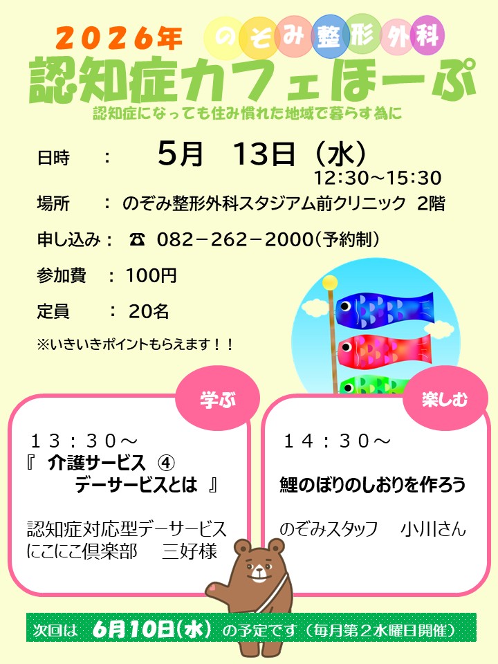 5月13日(水)認知症カフェほーぷ開催のお知らせ-のぞみ整形外科スタジアム前クリニック-