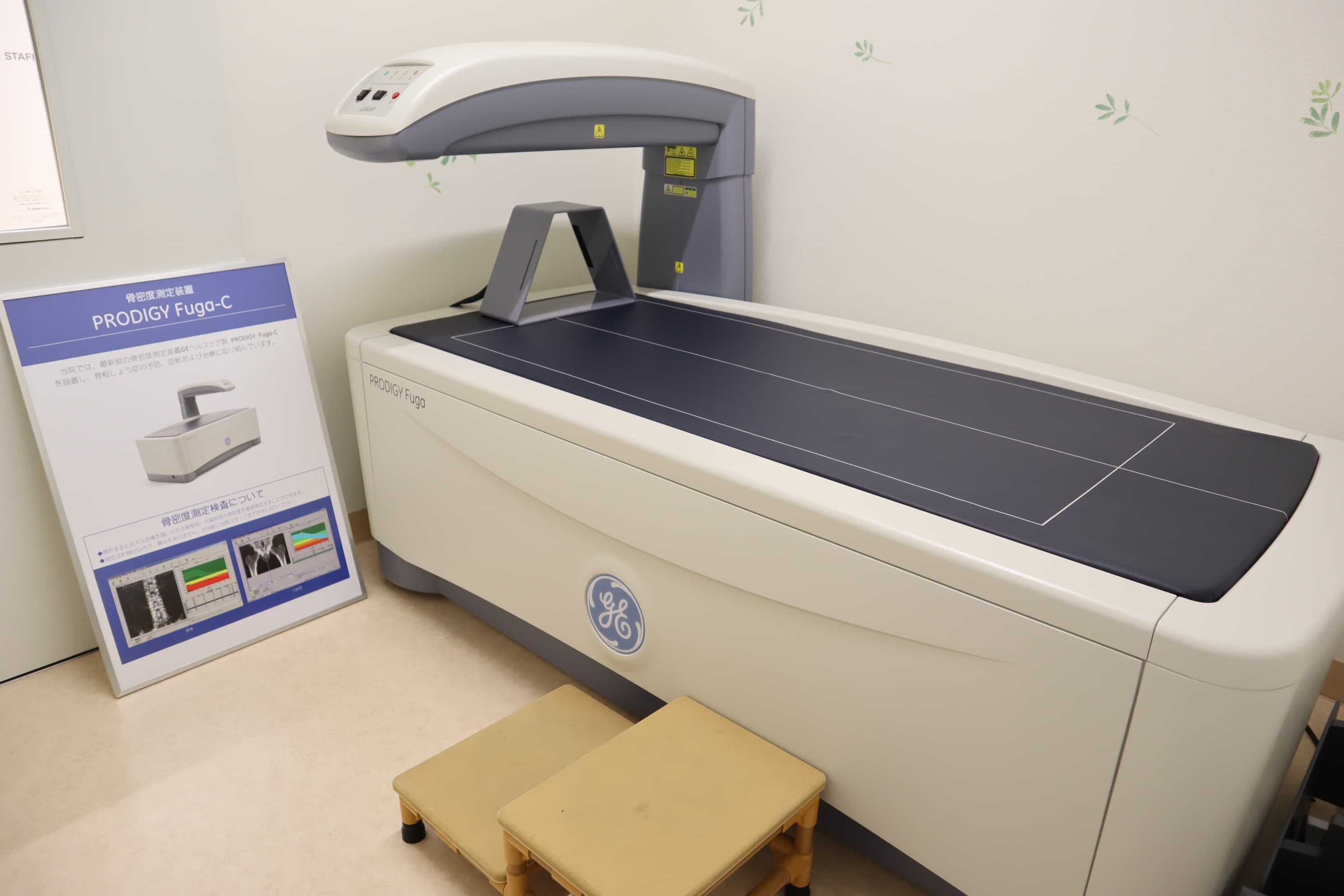骨粗鬆症とは骨がもろくなり骨折しやすい状況になることで、初期には痛みなどの症状がないため気が付きにくく沈黙の疾患といわれており、日本人に少なくとも2000万人はいるといわれています。当院では整形外科として骨粗鬆症の予防・治療にも力を入れており骨密度測定装置も導入しています。当院の骨密度測定装置は世界で初めて『デュアルエネルギー測定機能』と『シングルエネルギー測定機能』を統合した装置で、日本骨代謝学会承認の診断基準である腰椎・大腿骨といった太い骨を測定することによって、最も正確な数値を測定できる装置です。椎体の圧迫骨折・大腿骨頸部骨折のリスクを知ることで寝たきり予防対策にもつながります。