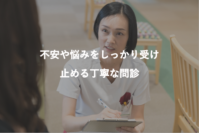 看護師が一番力を入れているところです。先生の診察に入る前に看護師が直接患者さんの問診をおこないます。患者さんの状態(痛み・辛さ・喜び)をしっかり共有し、診察に対してのニーズをしっかり引き出します。本人さんだけでなく家族背景も考えながらお話をさせて頂きます。問診は満足のいく診察に繋がる大事な役割です。その中で必要な検査など前もってお勧めさせていただくこともあります。 ドクターに言いにくい話も気兼ねなく看護師にお話くださいね。